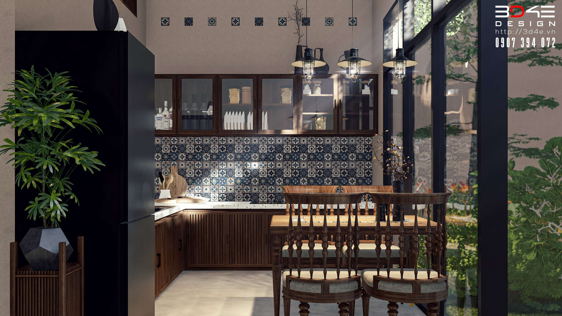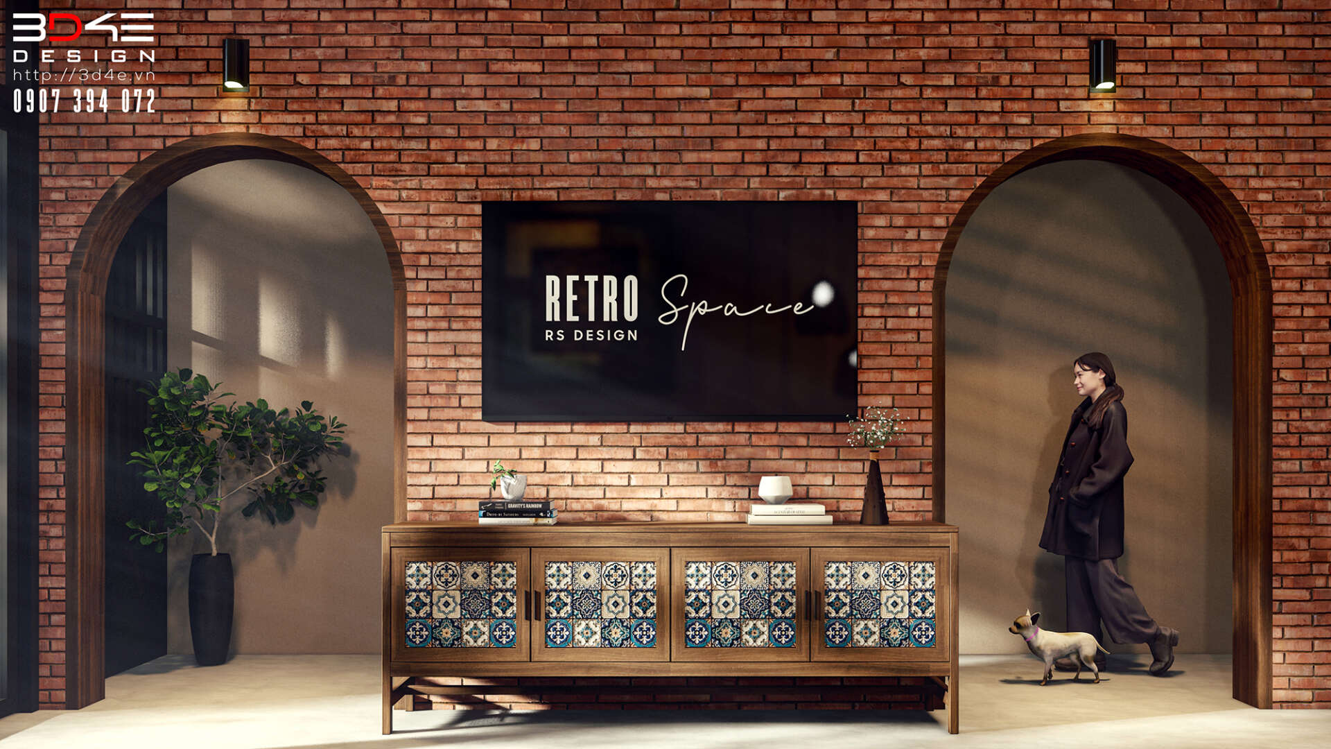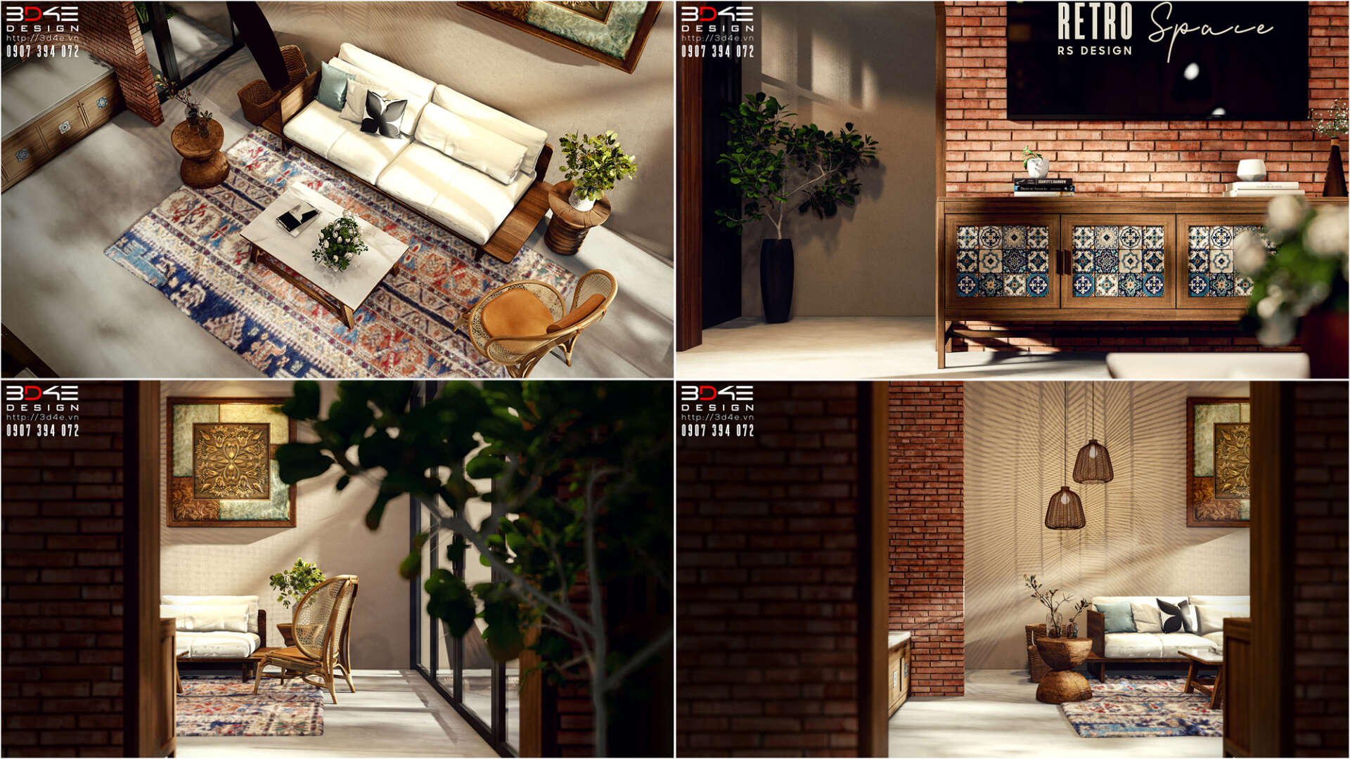 Không gian nội thất nhà anh Dũng được đội ngũ 3D4E thiết kế đậm chất retro, gợi nhớ vẻ đẹp hoài cổ của những thập niên trước nhưng vẫn đầy cuốn hút trong bối cảnh hiện đại. Các mảng tường được ốp gạch thẻ giả cổ tạo nên nền màu trầm ấm và mộc mạc, kết hợp hài hòa với một số khu vực tường được nhấn bằng gạch hoa văn giả cổ tone xanh – trắng, mang lại điểm nhấn sinh động và đầy nghệ thuật. Nội thất gỗ giữ vai trò chủ đạo, từ bàn ghế, kệ tủ cho đến các chi tiết trang trí, tất cả đều được chọn lựa kỹ lưỡng nhằm tái hiện không khí xưa cũ một cách chân thực nhưng không kém phần tinh tế.