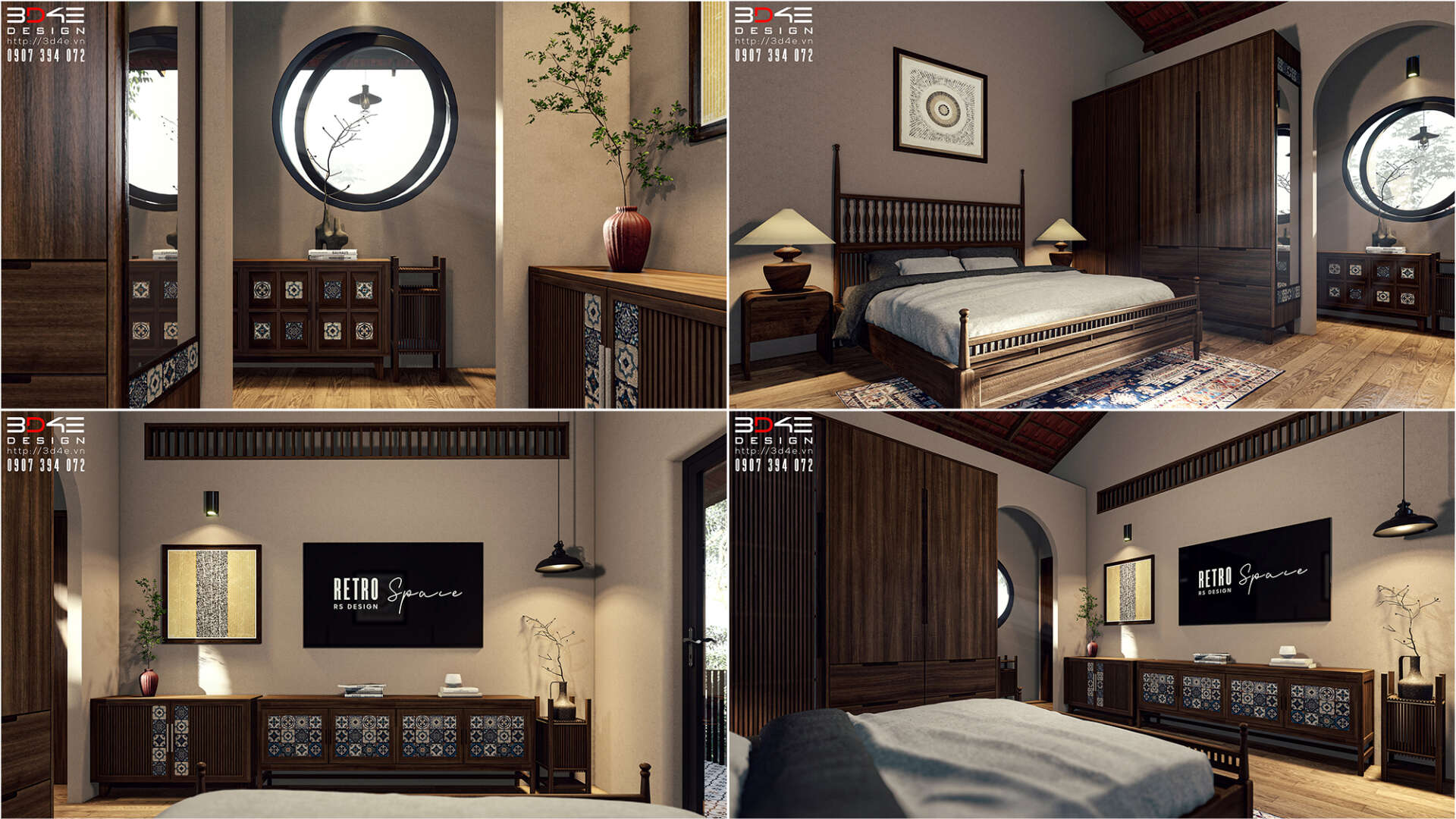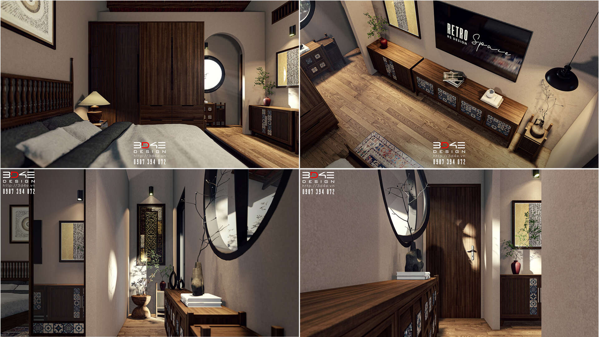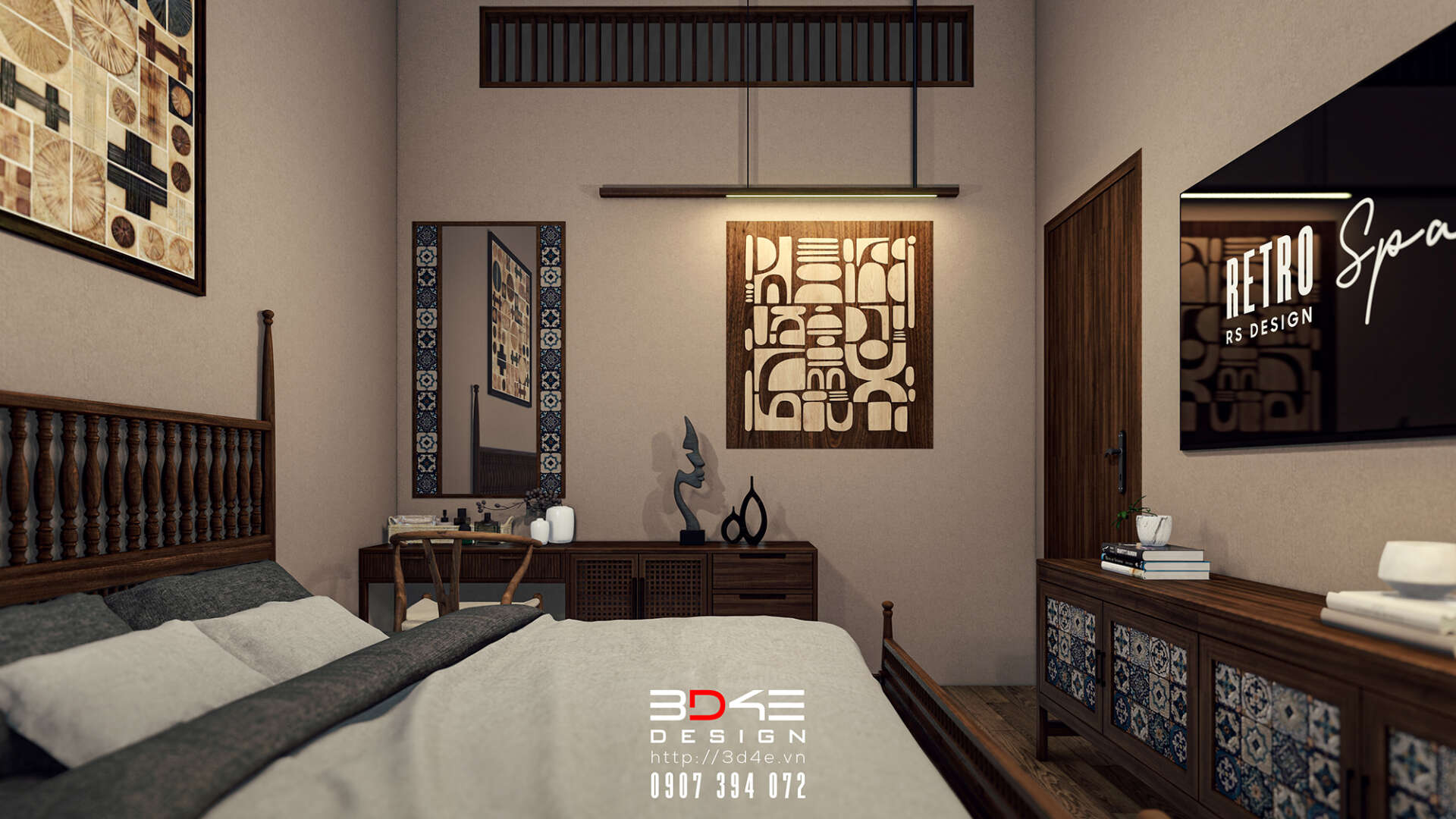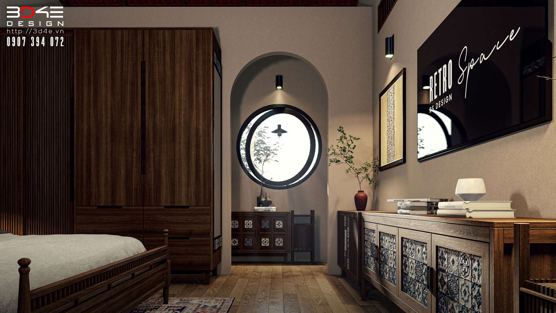 Không gian nội thất nhà anh Dũng được đội ngũ 3D4E thiết kế đậm chất retro, gợi nhớ vẻ đẹp hoài cổ của những thập niên trước nhưng vẫn đầy cuốn hút trong bối cảnh hiện đại. Các mảng tường được ốp gạch thẻ giả cổ tạo nên nền màu trầm ấm và mộc mạc, kết hợp hài hòa với một số khu vực tường được nhấn bằng gạch hoa văn giả cổ tone xanh – trắng, mang lại điểm nhấn sinh động và đầy nghệ thuật. Nội thất gỗ giữ vai trò chủ đạo, từ bàn ghế, kệ tủ cho đến các chi tiết trang trí, tất cả đều được chọn lựa kỹ lưỡng nhằm tái hiện không khí xưa cũ một cách chân thực nhưng không kém phần tinh tế.